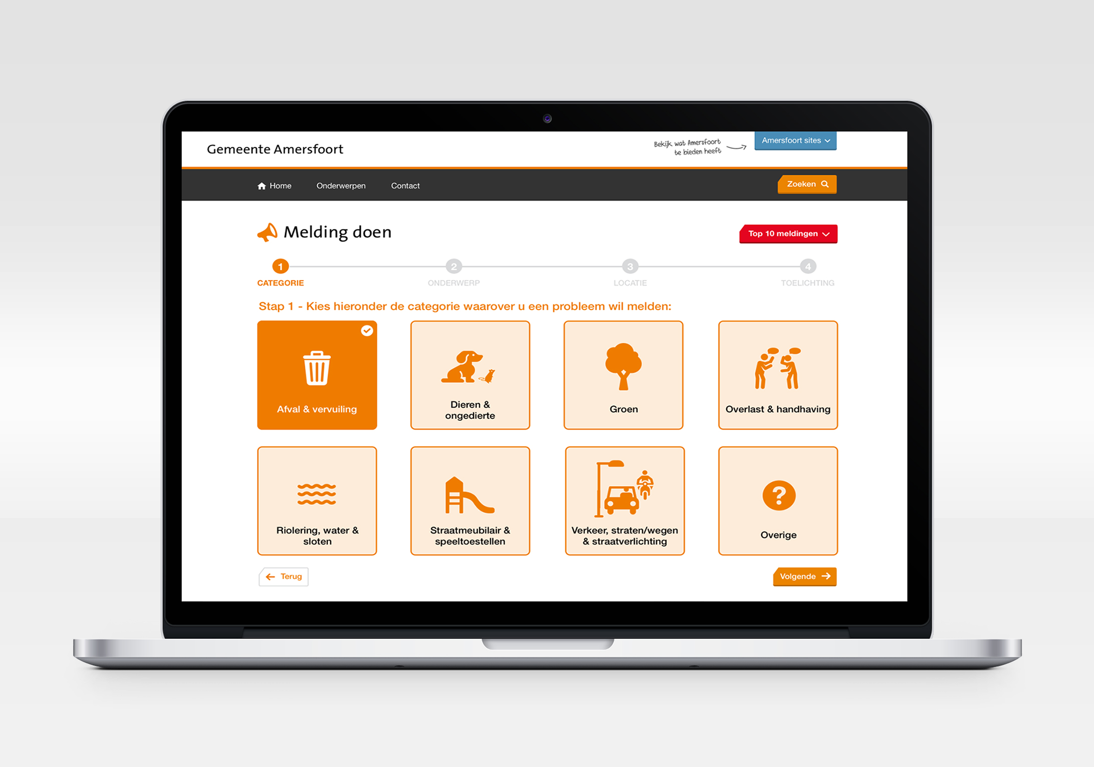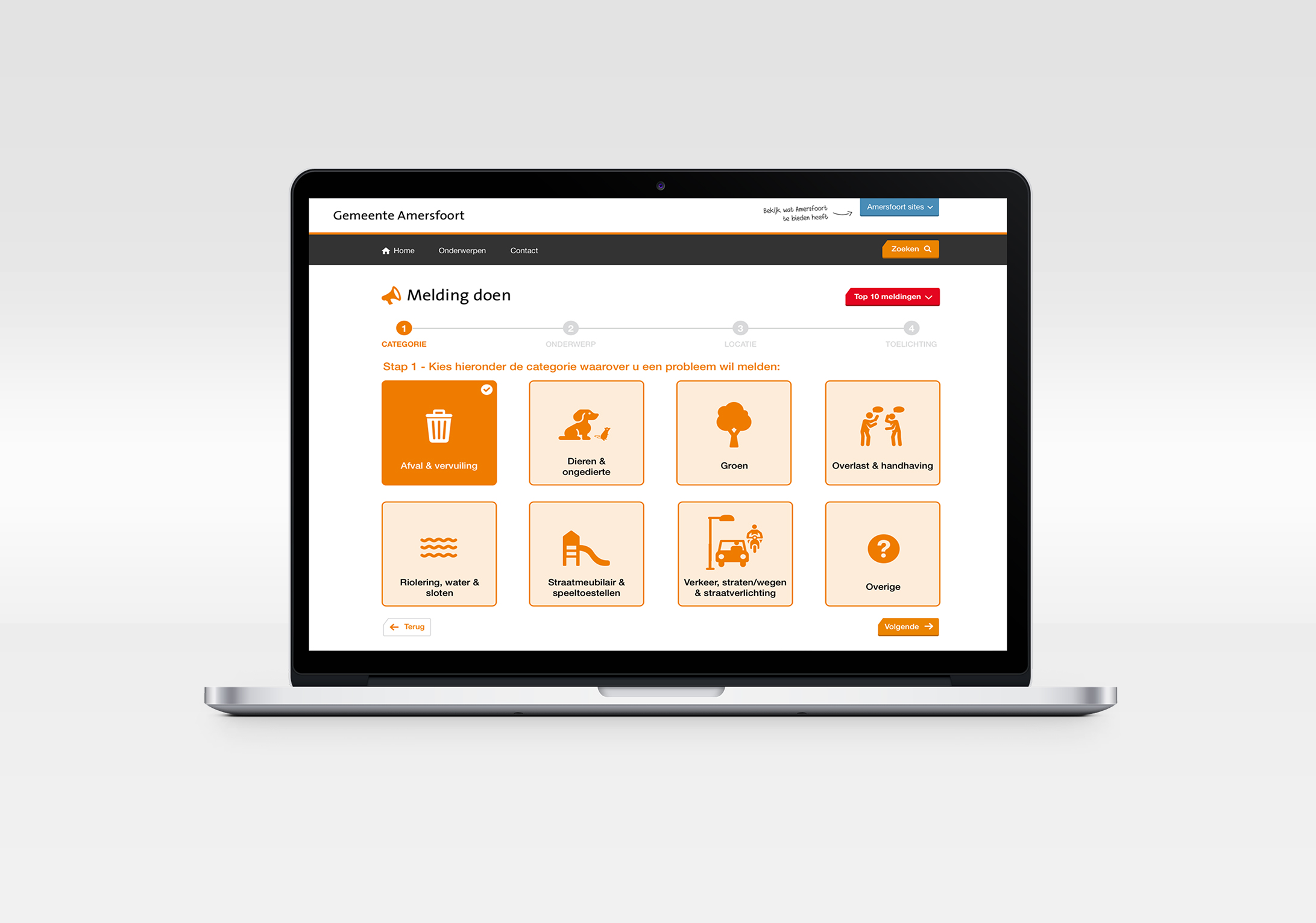 De gebruiker doorloopt een proces van 4 stappen, waarin hij/zij aangeeft bij welke categorie de melding hoort. Hierop wordt de informatie afgestemd.