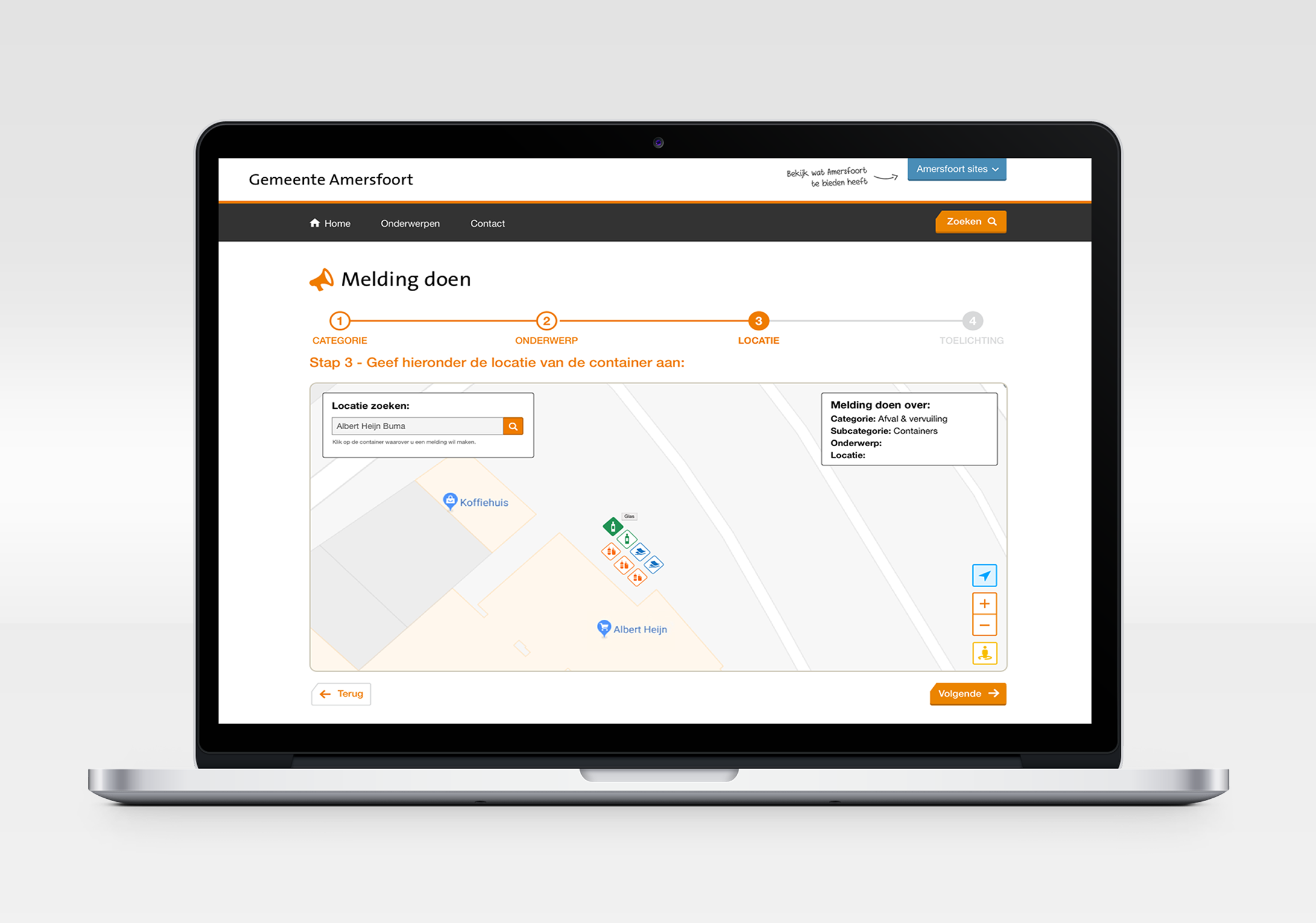 De gebruiker kiest een categorie, door op de categorie te klikken verschijnen er bijvoorbeeld afvalbakken/containers etc. Door op een container te klikken verschijnt er een pop-up. Daarin kan de gebruiker een melding doen.