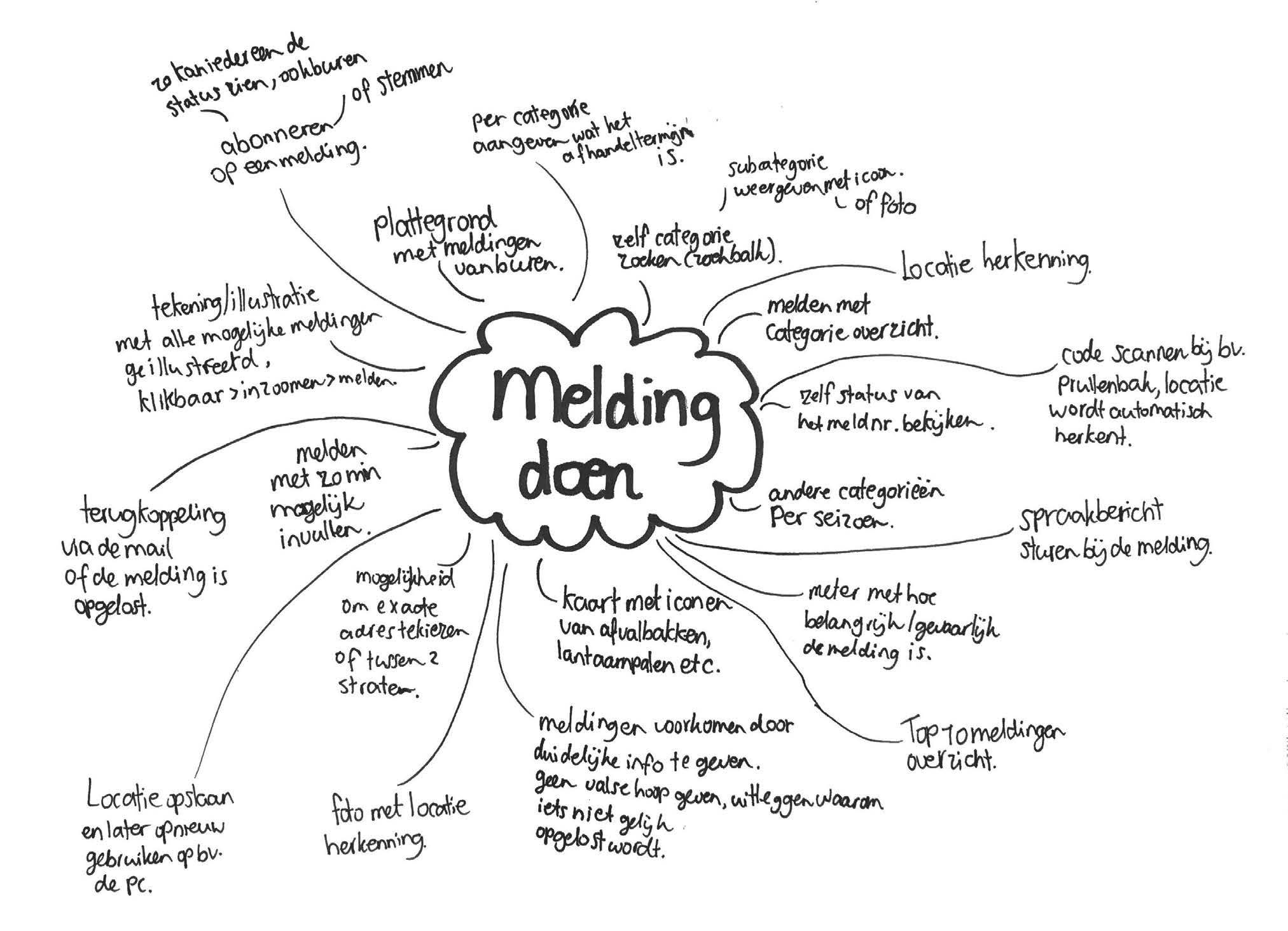 De eerste stap na het uitvoeren van het onderzoek was het doen van een brainstorm. Ik heb de belangrijkste informatie die nodig is bij het melden opgeschreven in de brainstorm. Daarbij heb ik concepten bedacht. Het zijn voornamelijk kleine ideeën die samengevoegd kunnen worden in een groot geheel.