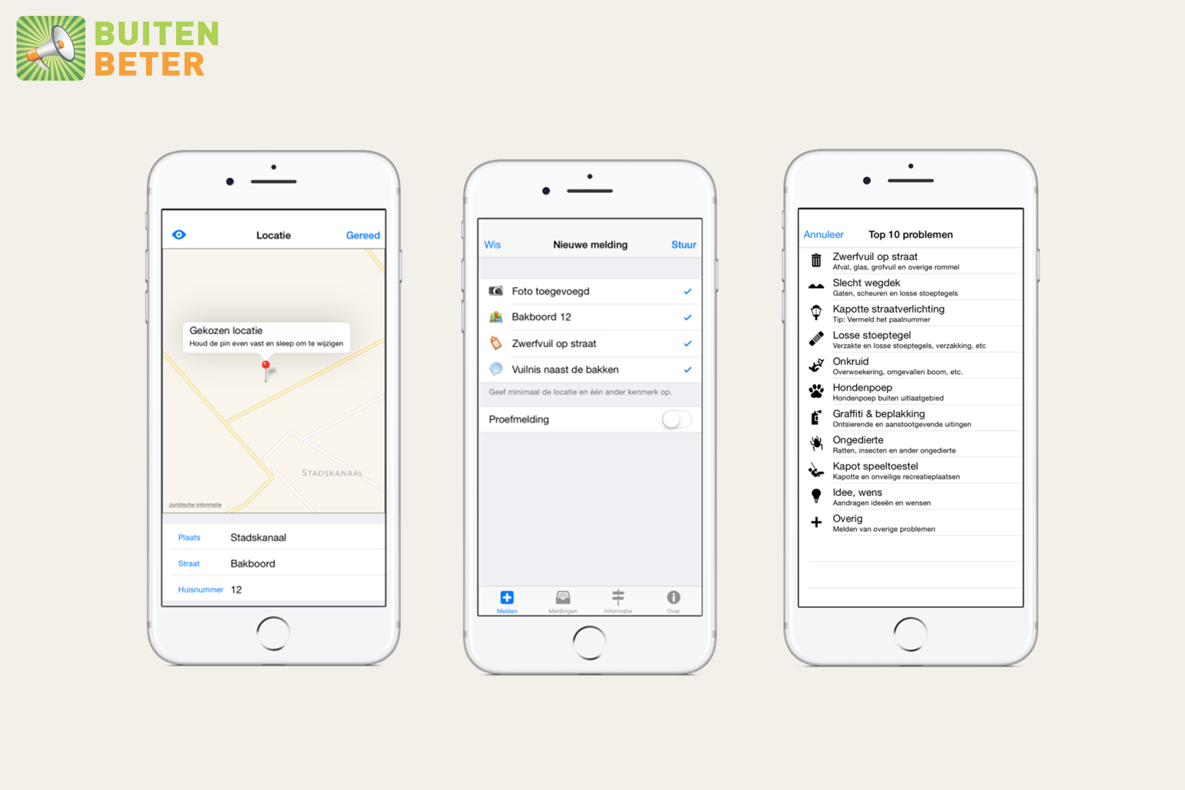 een melding gedaan via de mobiele website en op de desktop. Ook hebben ze een melding met de BuitenBeter App gedaan. Uit de testresultaten kwam naar voren dat de gebruikers het handig vinden als je locatie al herkent wordt. Ook het volgen van een paar stappen (in de BuitenBeter App) werkt voor de testpersonen makkelijker. In de BuitenBeter App is een omschrijving van het probleem niet verplicht, wel moet er een categorie uit de top 10 problemen worden gekozen. Bij het invullen van persoonlijke gegevens, willen ze liever de mogelijkheid hebben om te kiezen. Het liefst met zo min mogelijk gegevens. De BuitenBeter App vraagt bijvoorbeeld om je straatnaam en postcode, dit vinden ze overbodig.