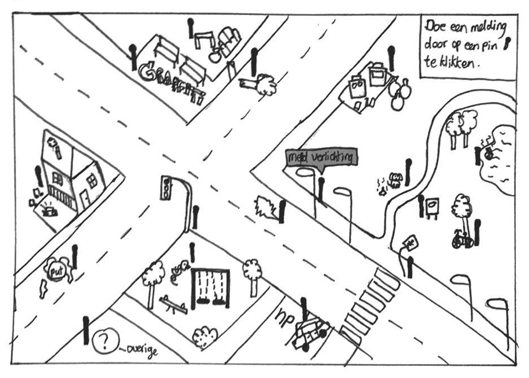 In een illustratie is te zien wat voor problemen er gemeld kunnen worden. Door op een pin te klikken, kan de gebruiker een melding doen. Daarna verschijnt er een nieuwe pagina met een invulformulier voor het doorgeven van de locatie, omschrijving etc.