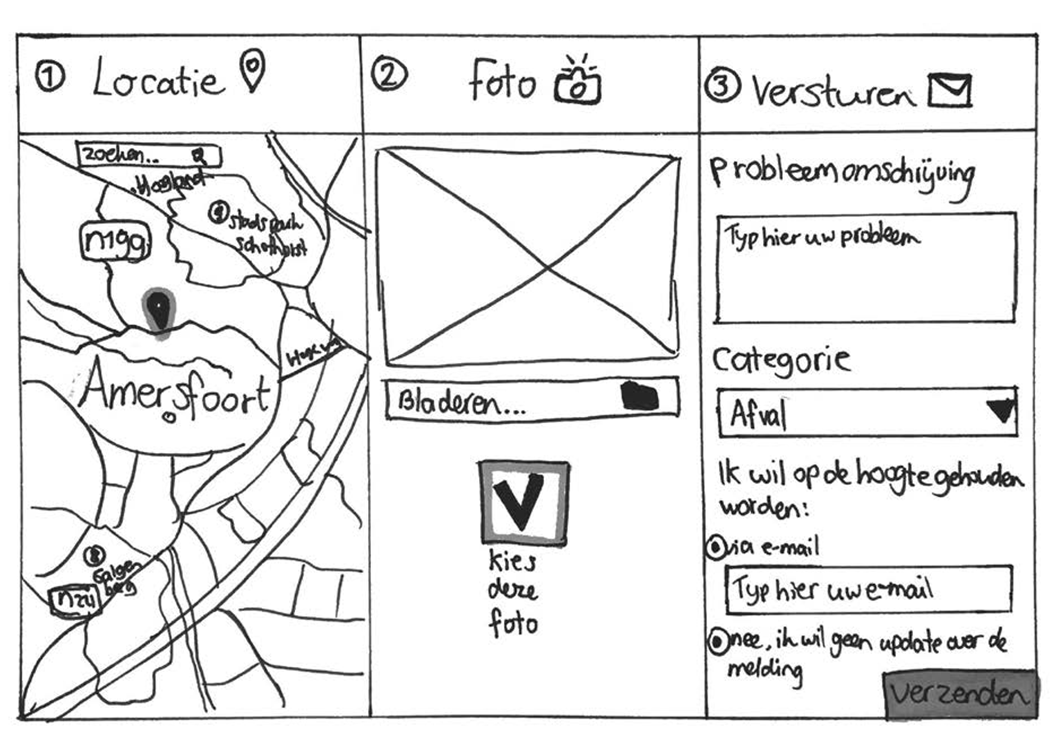 “Hoe kan een website voor de Gemeente Amersfoort ervoor zorgen dat de bewoners op een efficiënte manier een complete melding doen van een probleem in de openbare ruimte, waarbij het probleem en de locatie duidelijk vermeld wordt en waarbij dit voor de bewoner en de medewerkers van de gemeente zo min mogelijk tijd kost?”