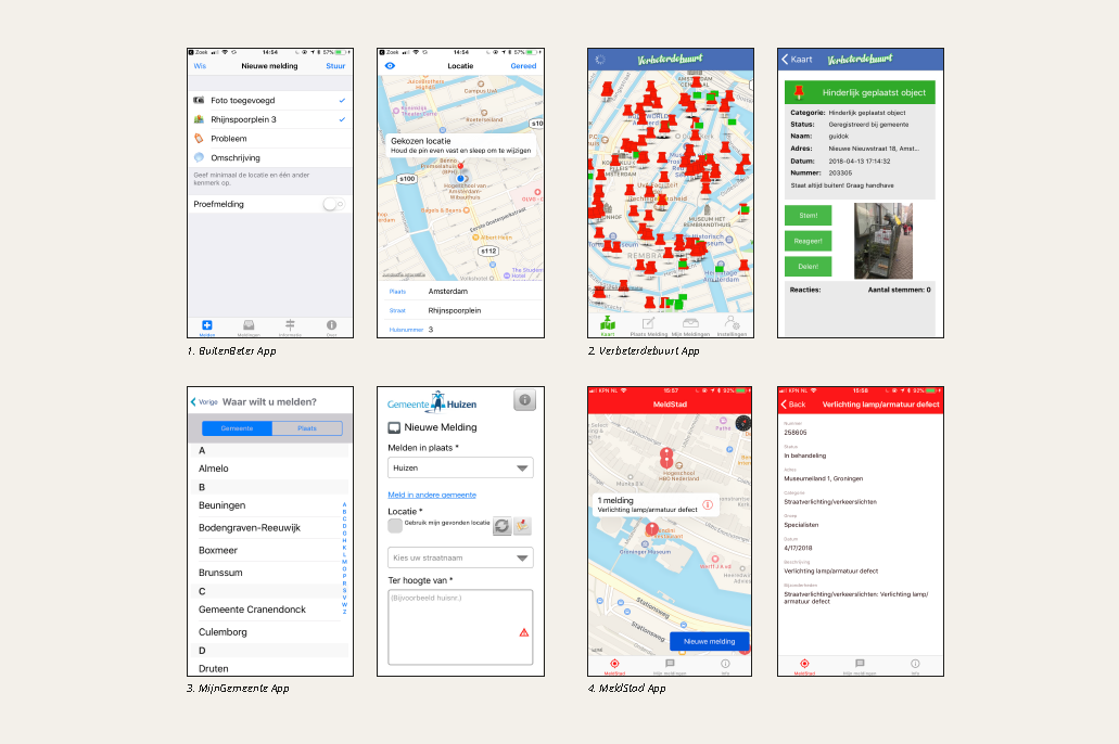 Ik heb concurrentie onderzoek gedaan naar vier apps waar een bewoner een melding kan doen. In deze apps moet je een melding doen op een kaart. Na het aangeven van de juiste locatie moet de melder een omschrijving geven, eventueel een foto uploaden en een categorie kiezen. Bij de app Verbeterdebuurt en MeldStad kun je ook meldingen zien van andere bewoners en de status daarvan. Ook heb ik gekeken naar websites van andere gemeente. Bij de Gemeente Utrecht wordt er bijvoorbeeld gebruik gemaakt van een kaart bij het doorgeven van meldingen. Op de kaart kun je ook zien of er al een melding gedaan is.
