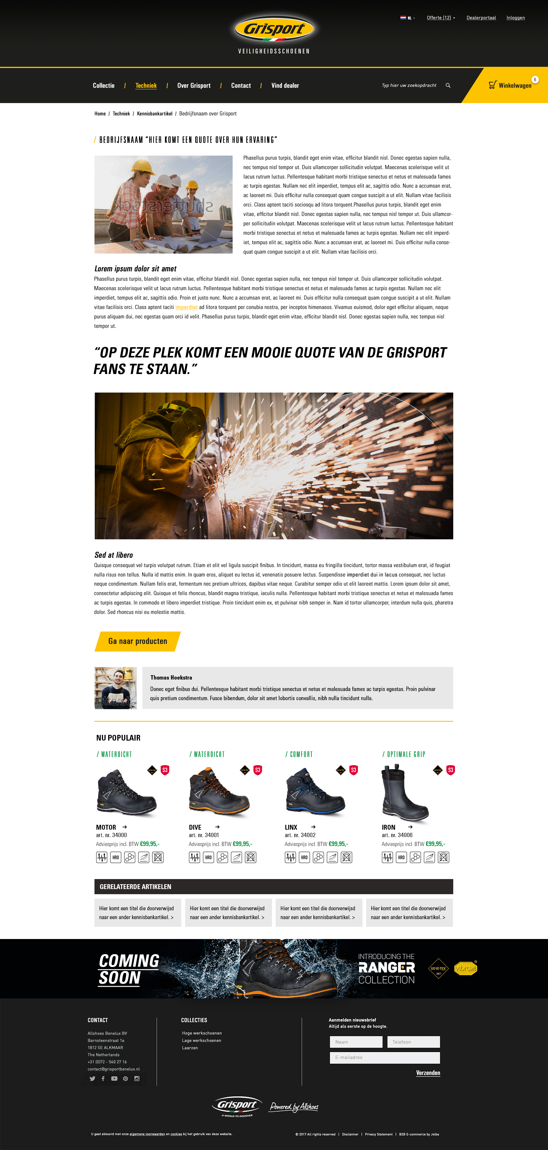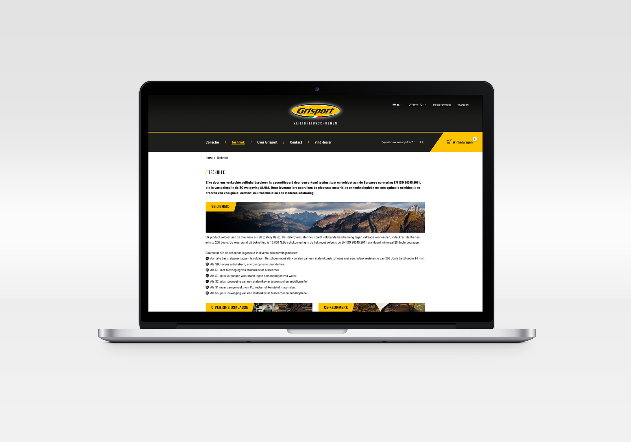 Mijn bedrijfsbegeleider heeft voor Grisport de homepagina, het productoverzicht en productdetailpagina ontworpen. Na goedkeuring van de klant moesten er ook andere pagina’s gemaakt worden. Ik kreeg de opdracht om een de andere pagina’s te ontwerpen. Ook was er een User Interface Kit nodig voor de Front-End Developer. Grisport verkoopt Italiaanse veiligheidsschoenen, geïnspireerd op de specifieke wensen uit de bergwandelsport. Beschermend, stoer, eigentijds en comfortabel.
