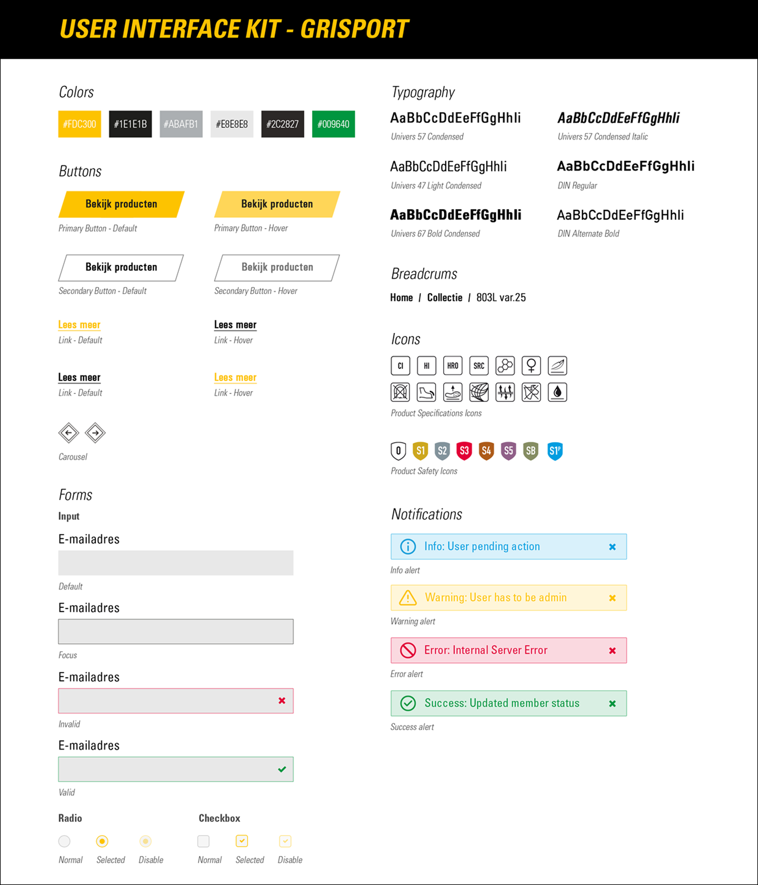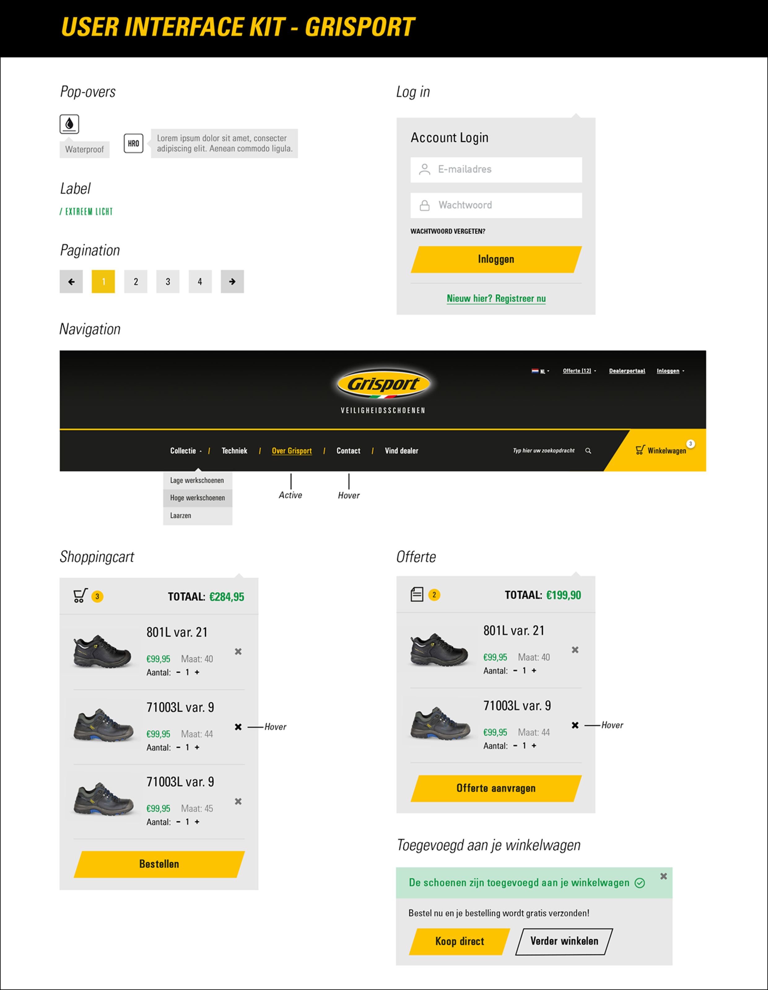 Voor Grisport heb ik een User Interface Kit in Adobe Photoshop gemaakt. Hierin staan alle UI elementen die de Front-End Developer nodig heeft bij het bouwen. De kleuren, typografie en meeste buttons waren al terug te zien in het ontwerp op de homepagina. In het UI Kit zijn nieuwe elementen te zien die ik heb vormgegeven. Zoals het winkelwagentje, account log in, offerte aanvraag en formulieren.