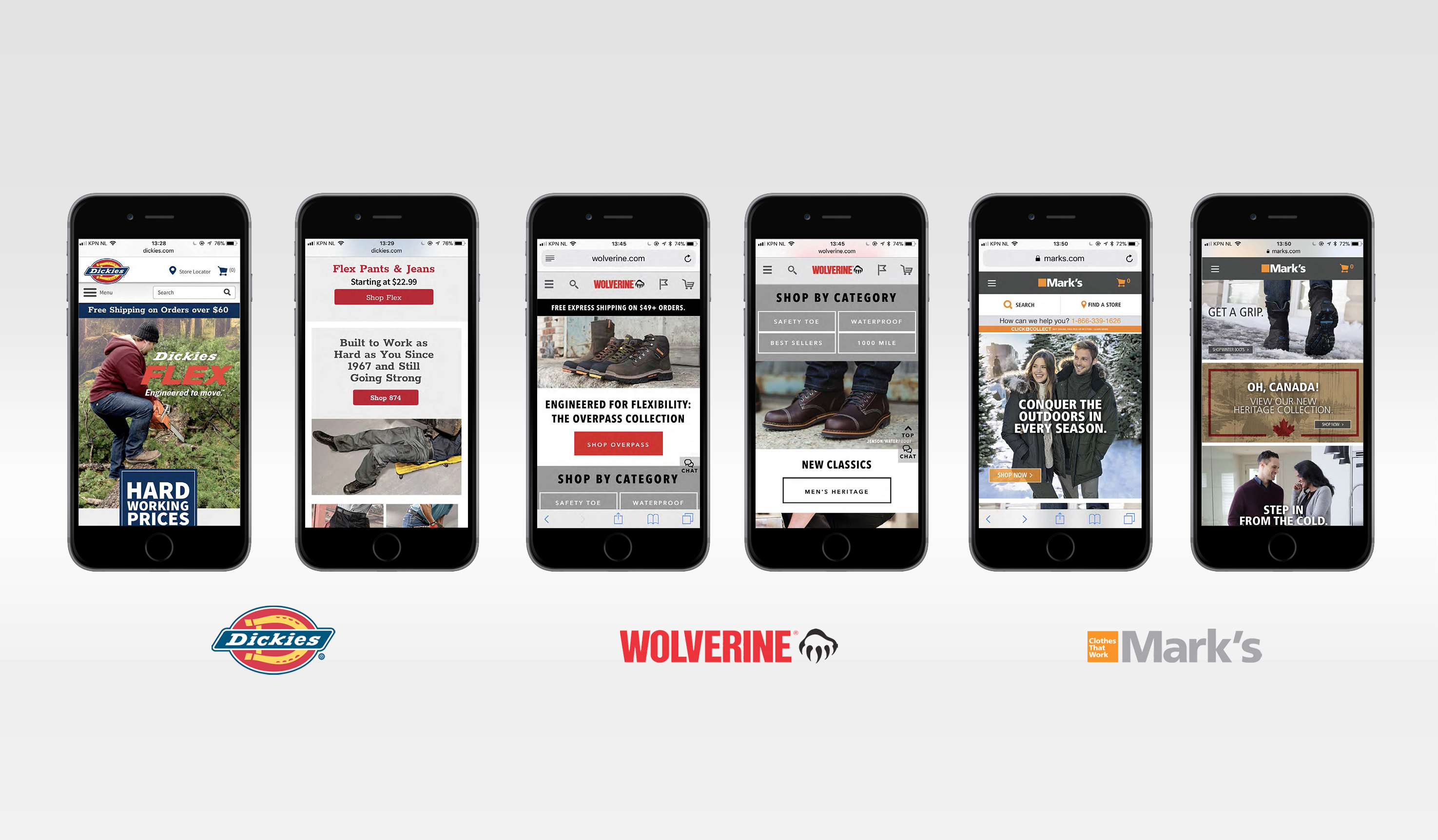 Om goede oplossingen te bedenken voor de gebruikersproblemen, heb ik gekeken naar concurrenten die ook werkkleding verkopen. Wat ik goed vind aan Dickies.com is dat je op de homepagina duidelijk ziet dat ze werkkleding verkopen door de sfeerbeelden. Op de homepagina kun je al gelijk doorklikken naar 4 categorieën. Zo komt de gebruiker sneller bij zijn doel, wat kan zorgen voor meer conversie. Op Wolverine.com is een opvallende button te zien die doorlinkt naar een nieuwe collectie. Ook kun je op de homepage al gelijk per categorie zoeken, in plaats van eerst naar het menu te hoeven te gaan. Bij Marks zie je dat de afbeeldingen de content versterken. Bijvoorbeeld bij de afbeelding van schoenen in de sneeuw, is het duidelijk dat die schoenen voor grip zorgen.