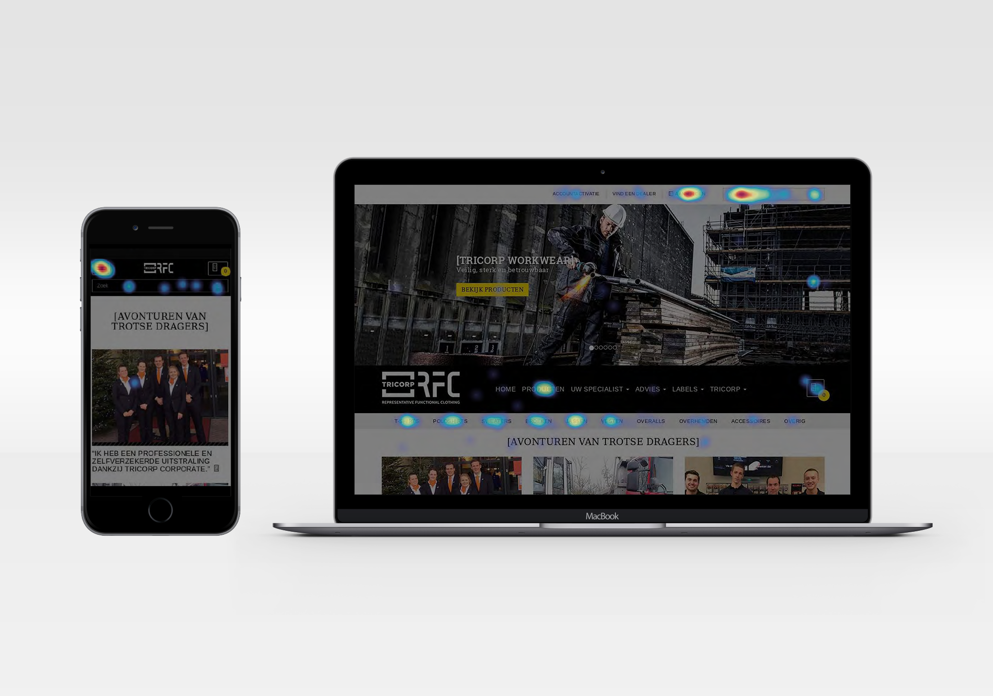 In de heatmaps van de homepagina is te zien dat er veel gebruik wordt gemaakt van het menu. Ook is er in Hotjar een heatmap te zien over hoe ver de gebruiker scrollen op de pagina. Zonder te scrollen is het percentage 100%, daarna wordt het percentage al gelijk lager. De helft van de bezoekers scrolt naar de populaire producten. De content over ‘Marktleider in moderne werkkleding’, ‘Verschillend hetzelfde’, ‘Trends & Innovaties’ en ‘Nieuws’ wordt door ongeveer 30% van de bezoekers bekeken.
