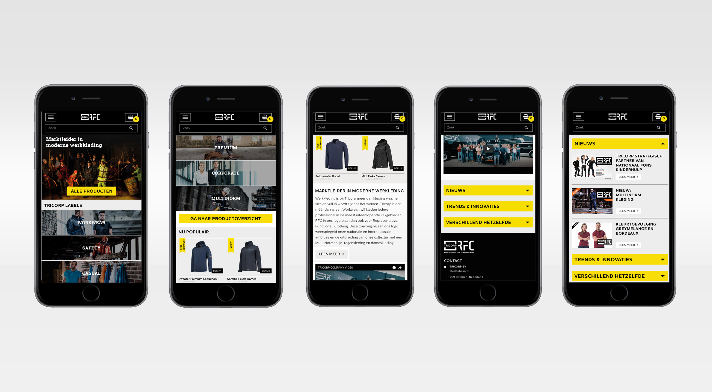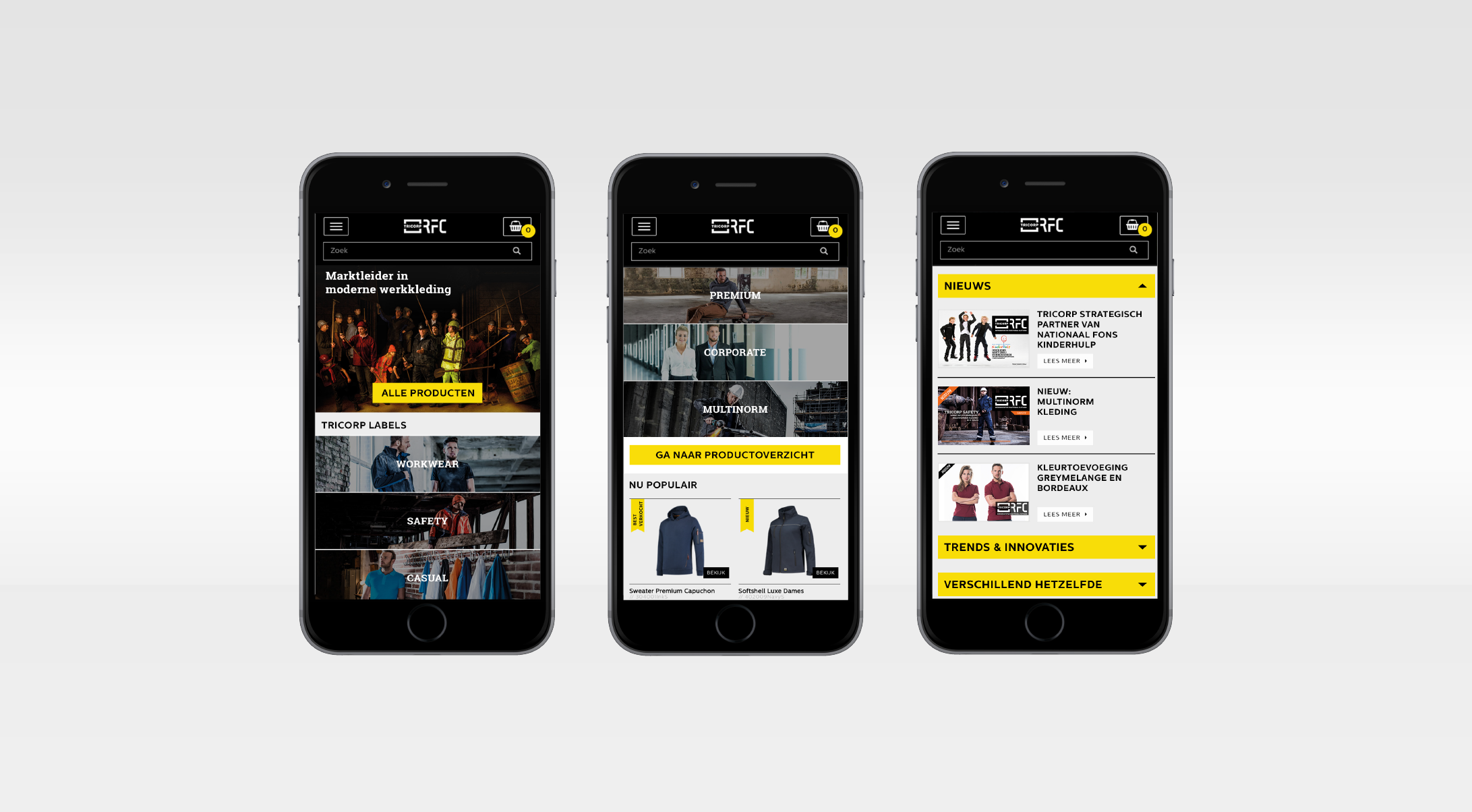 Bovenaan de pagina heb ik een sfeerbeeld met slogan/quote toegevoegd. Zo is het voor de bezoeker gelijk duidelijk dat Tricorp werkleding verkoopt. Bij het sfeerbeeld is er een call to action die naar alle producten gaat. Zo hoeft de bezoeker niet het menu te openen om producten te zoeken. Onder het sfeerbeeld zijn afbeeldingen van de Tricorp labels te zien. De beelden versterken waar het label voor staat en de gebruiker komt sneller tot zijn doel. De minder belangrijke content, zoals bijvoorbeeld nieuws is ingeklapt, zo kan de gebruiker zelf kiezen wat hij/zij wil lezen. Met het herontwerp krijgen bezoekers een duidelijker beeld van wat Tricorp verkoopt, dit kan zorgen voor een lager bouncepercentage.