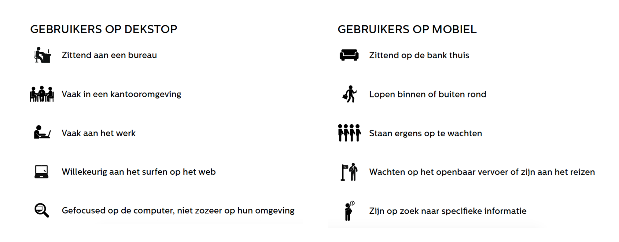 Gebruikers op de desktop gaan er vaak even rustig voor zitten als ze een website bekijken. Maar de mobiele bezoeker wil gelijk vinden waar hij naar op zoek is. De mobiele gebruiker is op zoek naar specifiekere informatie. Wanneer hij deze informatie niet vindt, zal hij snel vertrekken.